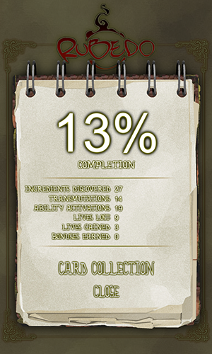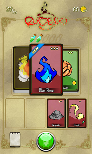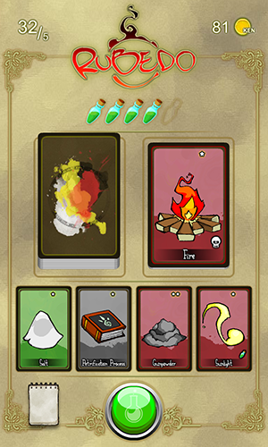 Rubedo (latin for "redness" and signifies alchemical success) is a collectable card game where you use your knowledge of base ingredients to combine, create and discover new ingredients. Your aim is to create different ingredients and manipulate their properties in order to form a philosopher's stone which is a mythical element whose properties are able to change simple elements such as lead to gold.
